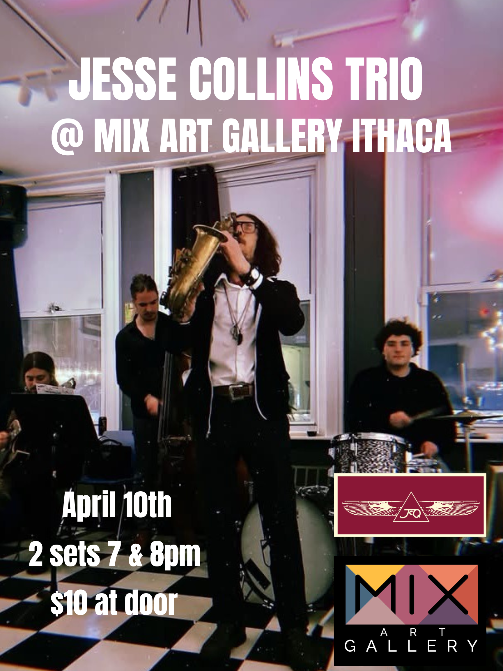 Experience a special evening of live jazz with the Jesse Collins Quartet at MIX Art Gallery. Blending improvisation, soulful rhythms, and contemporary jazz influences, this dynamic ensemble transforms the gallery into an intimate, vibrant listening space. Join us for an unforgettable night where art, music, and community come together in downtown Ithaca right on the Commons.